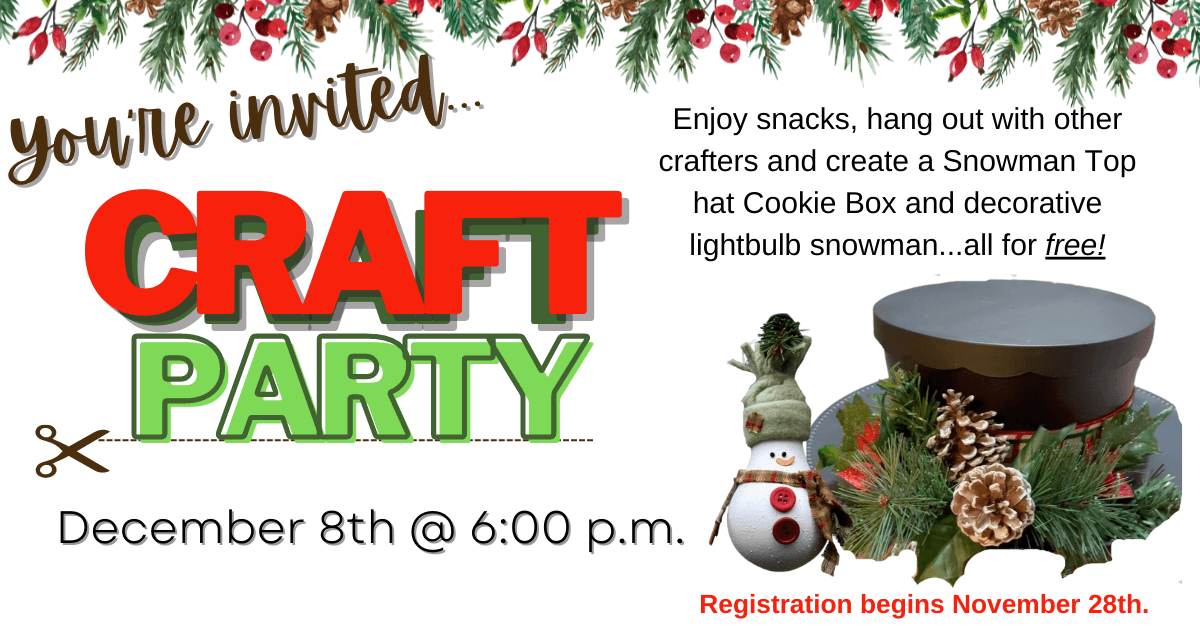 Join Miss Rachel for Craft Party at 6:00 p.m. on Thursday, December 8 in the library’s large meeting room. She will show you step-by-step how to make a Snowman Hat Cookie box perfect for gifting to friends. Then make a homey snowman on a rustic wood slice using flannel and a lightbulb.